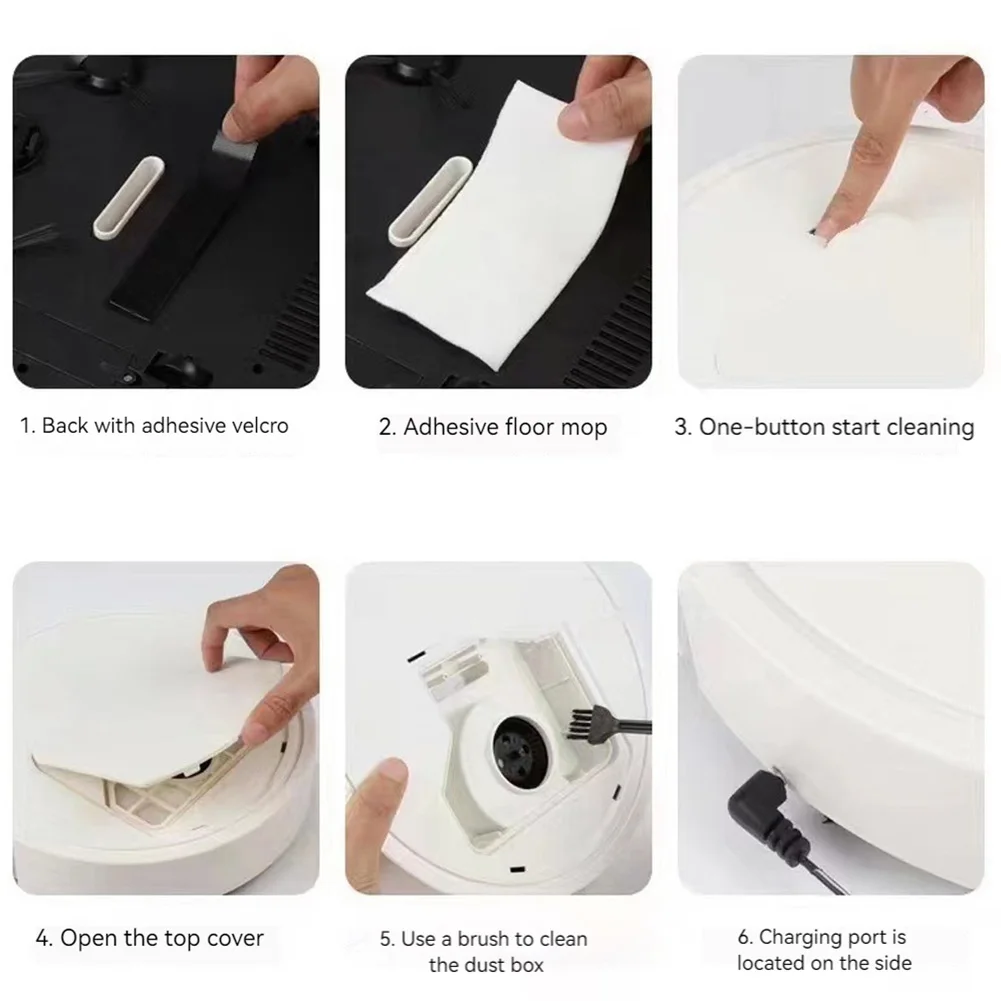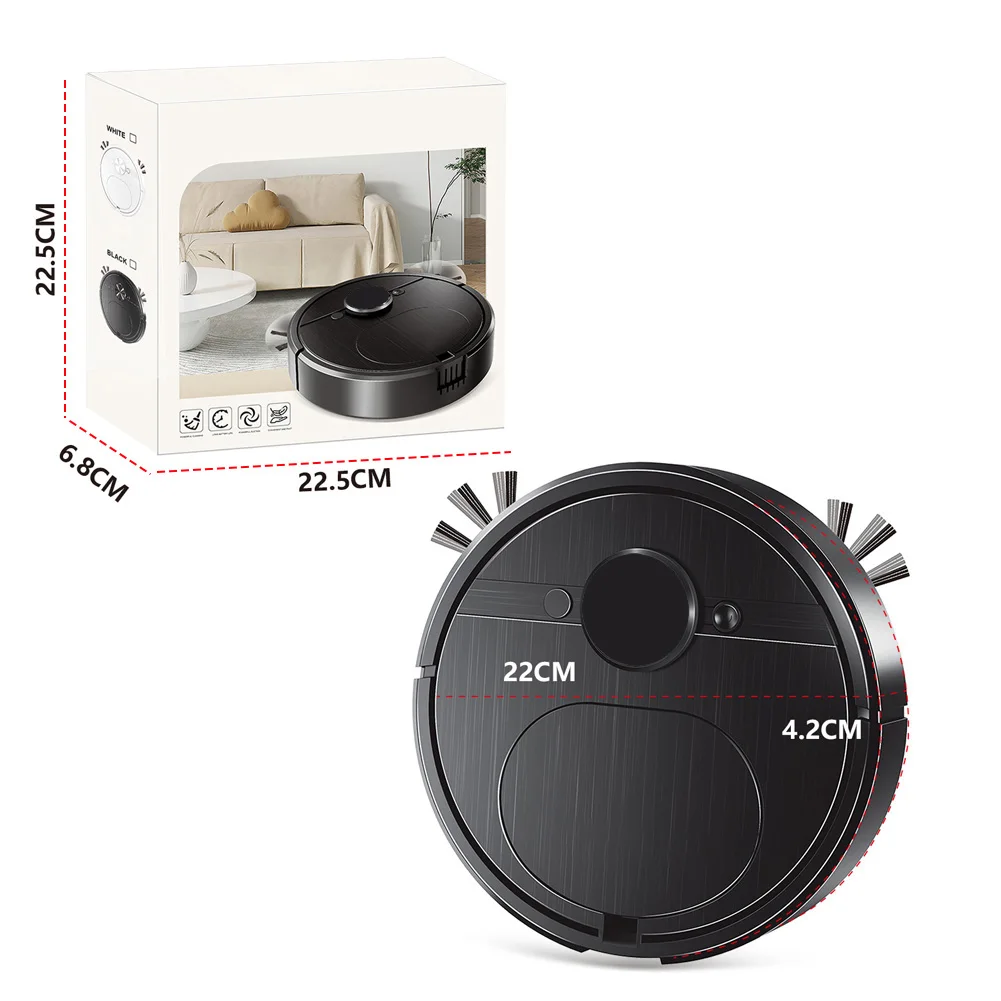 Note: 3 In 1 Smart Sweeping Robot with Brush & Mop Robot Vacuum Cleaner Automatic Cleaning Machine for Pet Hair Carpets Floors Features: 1.Multifunctional Cleaning Machine: The smart sweeping robot features sweeping, mopping, vacuuming, humidifying, and purifying functions, efficiently cleaning floor dust and debris for a clean and comfortable home. 2.Strong Suction Power: With strong power sweeping machine, it easily absorbs stubborn floor dust and can move in multiple directions, cleaning large areas without dead corners for higher efficiency. 3.Easy Operation & Long Battery Life: Intelligent wiping floor robot with one-button start, charges for 4-5 hours, and works for 60-120 minutes, meeting your daily cleaning needs. 4.Ultra-Thin Design: The automatic cleaning machine is designed with a 60mm ultra-thin body, allowing you to clean under wardrobes, sofas, and beds thoroughly. 5.Suitable for Multiple Floor Types: This robot vacuum cleaner is for cleaning various smooth floors like marble, tile, and wood. Specification: Origin: Mainland China Product packaging size: 225.00x225.00x68.00mm/8.86x8.86x2.68inch Rated voltage: 3.7V Function: mopping, sweeping and suction Rated power (watt): 3 watts
