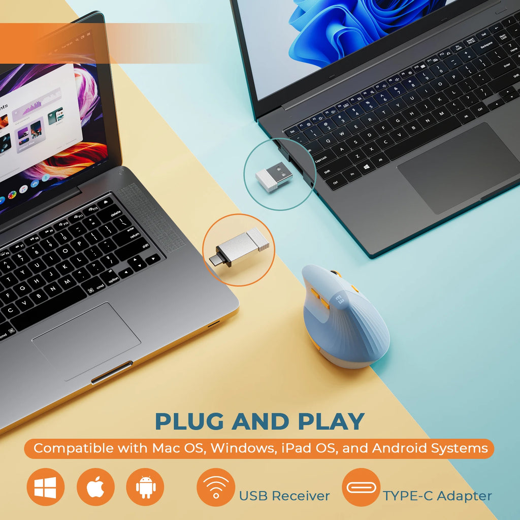 【Type C Adapter & 2.4G USB Connection】Type C wireless mouse supports 2.4G and Type C wireless connections. mouse for Mac OS Windows iPad OS Android systems. It works with laptops, desktops, tablets, smartphones, game consoles, and devices with a Type C interface like monitors, projectors, and TVs (Note: Type C adapter included in the package, please remember to take it out)